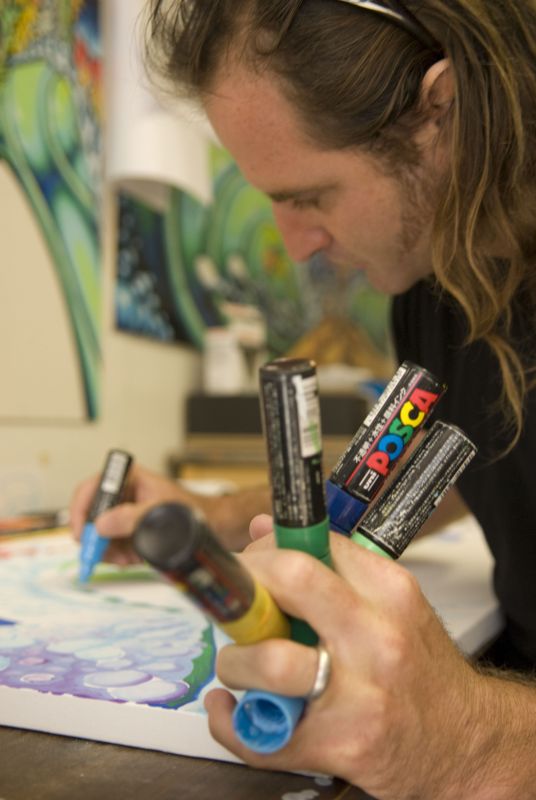 Recommended side job for artists during dry spells: Apply your art to what your other passions are – if you love motorcycles, find a way to incorporate your art into that field. I love surfing, so I’ve painted a lot of surfboards and it’s brought in a lot of income.